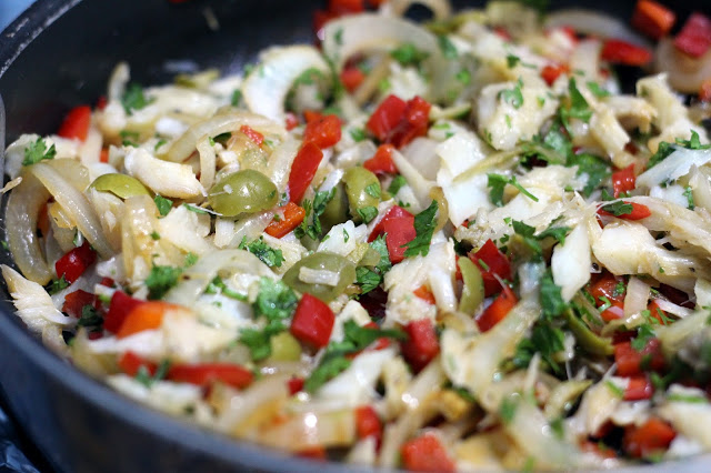 - Adicione o bacalhau e as azeitonas