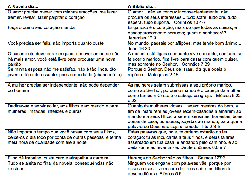 Quando digo isso, não me refiro apenas a cenas imorais e provocantes, mas também àquelas que vão moldando a nossa forma de pensar gradativa e sutilmente. Isto não é feito de forma aberta e honesta, expondo os objetivos corruptos e o desprezo a Deus e a seu reino. Façamos, então, uma rápida análise de alguns conceitos massivamente expostos nas novelas, contrapondo-os ao padrão que devemos seguir: (clique na imagem para ver o quadro maior)